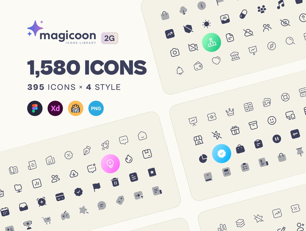 magicoon 2G is a set of high-quality essential UI icons, modernly designed with stylish touches, featuring multiple formats, styles, and categories—perfect for designers and developers.