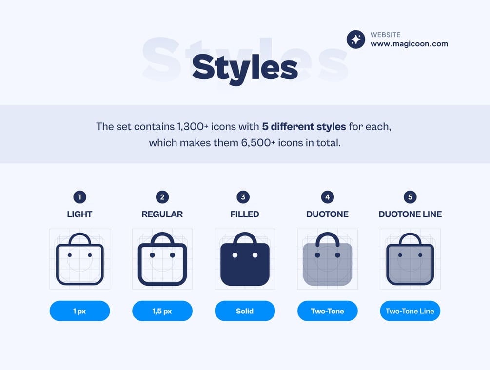- 5 Styles (Light, Regular, Filled, Duotone, Duotone Line).